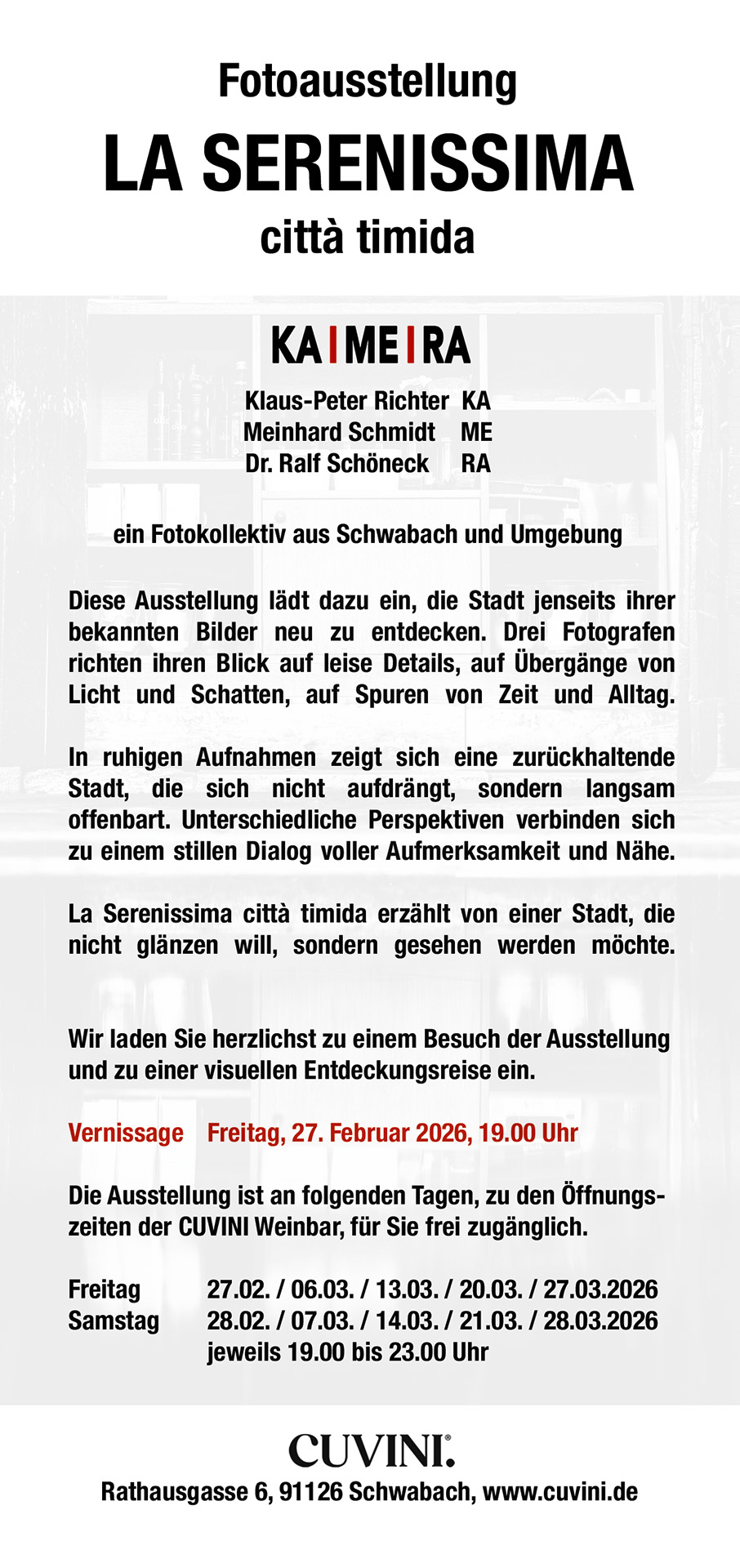 Unsere zweite Ausstellung des KA Ι ME Ι RA Fotokollektivs war eine zeitliche Herausforderung an uns, die wir im Team hervorragend gemeistert haben. Sehr kurzfristig haben wir die Möglichkeit bekommen, in der CUVINI Weinbar in Schwabach auszustellen. Innerhalb von 4 Wochen mussten wir ein neues Thema herausarbeiten, die passenden Bilder aus unseren Archiven auswählen, gemeinsam kuratieren und die Ausstellungsbilder als Fine Art Drucke finalisieren.